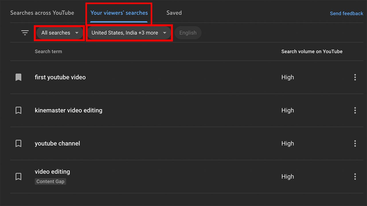 Here, you'll see a list of your viewers' searches on YouTube. As you scroll through this collection, look for keywords that best represent the videos you make. You can save relevant terms by clicking the bookmark symbol to the left.
