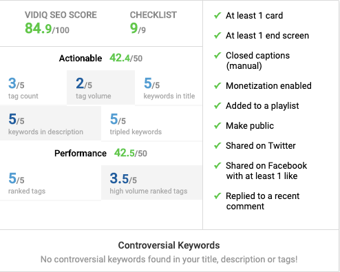 On the upload page with vidIQ installed, you’ll also find the optimization checklist. Ticking off everything you know your video needs to send the right signals to YouTube is a huge time-saver so please make sure you use this tool every time