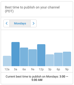 Staying on the upload page with vidIQ install, just select the date, and you’ll automatically see the best times. In this example, we chose a Monday, and the tool suggests that peak traffic occurs at 3am and 12pm PT. To ride the wave of the 12pm spike, we suggest posting your video between 3am and 5am PT. (Don’t worry, the tool adjusts the time zone based on your location).