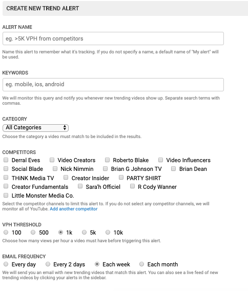 Let’s use ‘Fortnite’ as an example. Add that term as a keyword, and select a VPH Threshold of 100 views per hour. Then select how often you want to be notified of any Fortnite-focused video on YouTube that’s achieving that view metric.