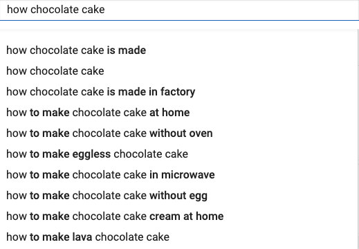 Look at all these titles that it is suggesting to us for ‘chocolate cake A’. Essentially, it's YouTube's own algorithm that says, "Look, so many people have searched for 'chocolate cake from home without oven'. Well, isn't that a perfect title for you to make your video?" You see how I'm honing in on the perfect title, and the perfect direction for my video before I even pick up my camera?