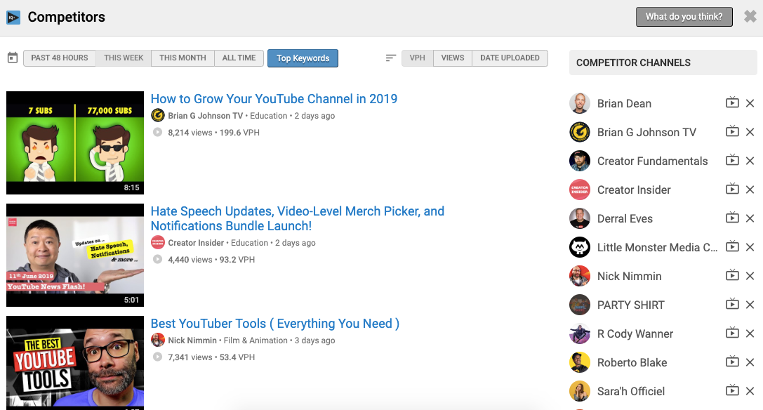 The Competitors tool is sorted by different time frames, and by views, views per hour (VPH), or by date uploaded, so you can really take a deep-dive into the data.