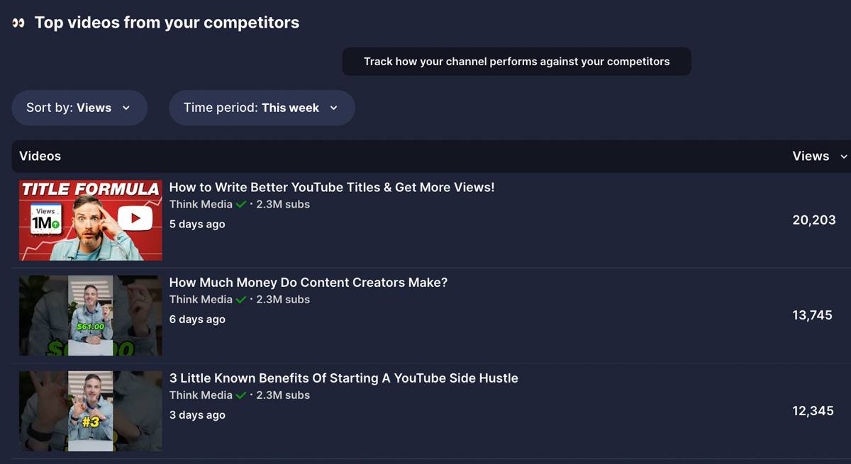 An easy way to do this is with vidIQ’s Competitor Tracking Tool. Sign up for the Pro plan ($10/month), then track multiple channels on YouTube based on video views, historical data, and other metrics.