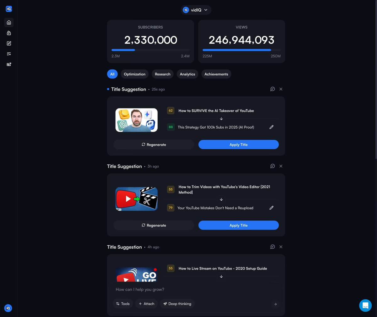 vidIQ AI Coach goes beyond generic AI by using your channel context and performance signals to deliver specific, actionable next steps. It's purpose built for YouTube, turning what your channel is doing into guidance you can use for your next upload.