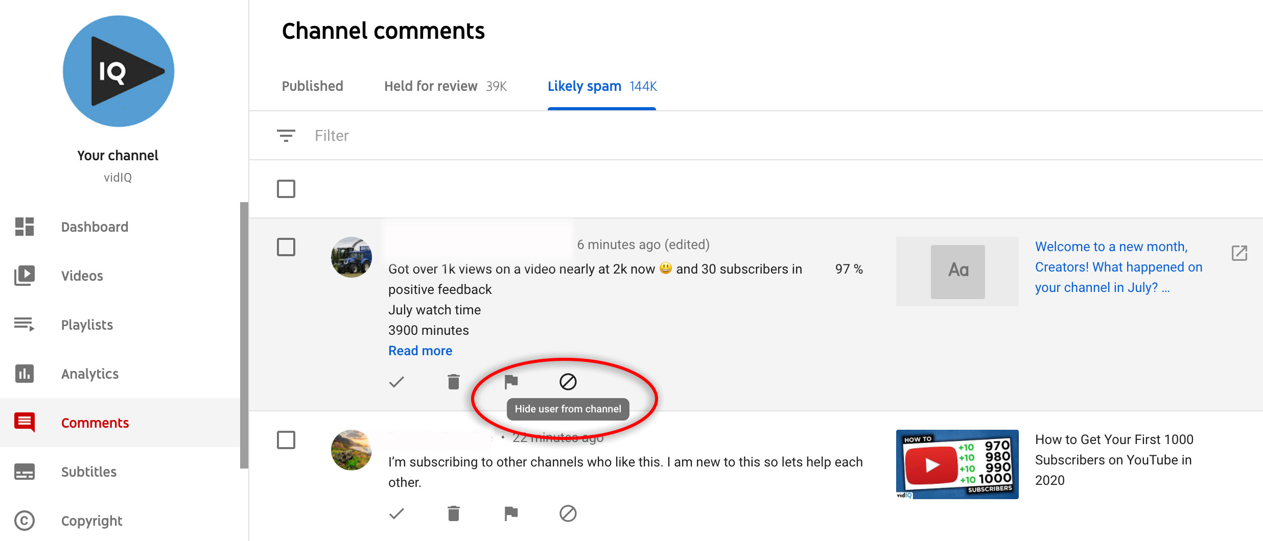 The next thing you’ll see is the ‘Channel Comments’ panel. In this section, select the ‘Likely Spam’ column to display this category of comments. These can often be your most inappropriate comments, so start here when you need to block certain users.